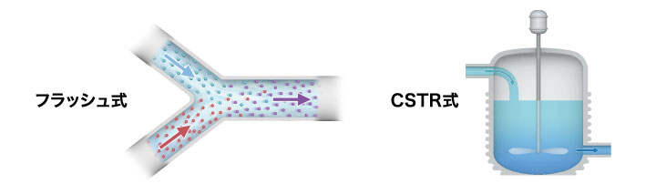 連続生産を行うには様々な方式がありますが、現在国内で行われている方式は主に2つ。フラッシュ式とCSTR式になります。タクミナのスムーズフローポンプは特にフラッシュ式で多く利用されています。