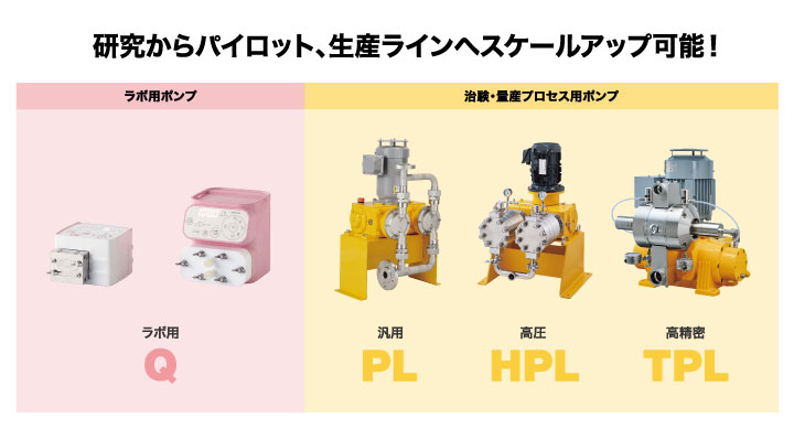 スムーズフローポンプはラボ・研究開発からパイロット、治験・量産プロセスまで同じ特長を持つポンプでスケールアップすることができるため、研究開発から次の工程へ進む際も新しいポンプを探す必要がありません。タクミナは全てのスケールでポンプをご提案させていただけますので、安心してご利用いただけます。