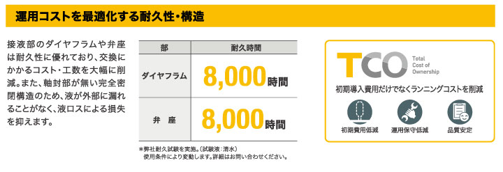 スムーズフローポンプは、耐久性にも優れているため、初期導入の費用だけでなくランニングコストも抑えることができます。さらに、環境性能にも優れているためSDGsにも貢献いたします。