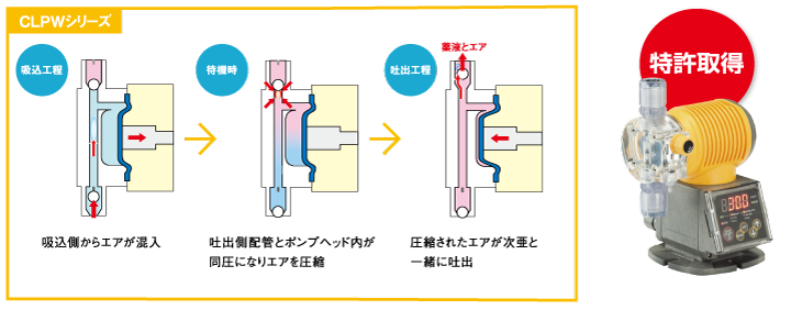 ポンプヘッド内のエアを圧縮し、インラインで確実に排除する特殊弁座機構(特許取得)を搭載。エア抜き用の配管も不要で、安全・確実なガスロック対策が行えます。